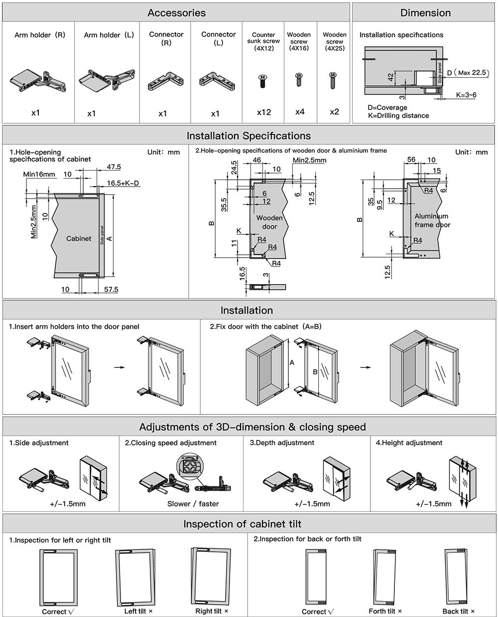4) Max. recommended shutter size with 2 hinges: Width≤600mm, Height≤2100mm